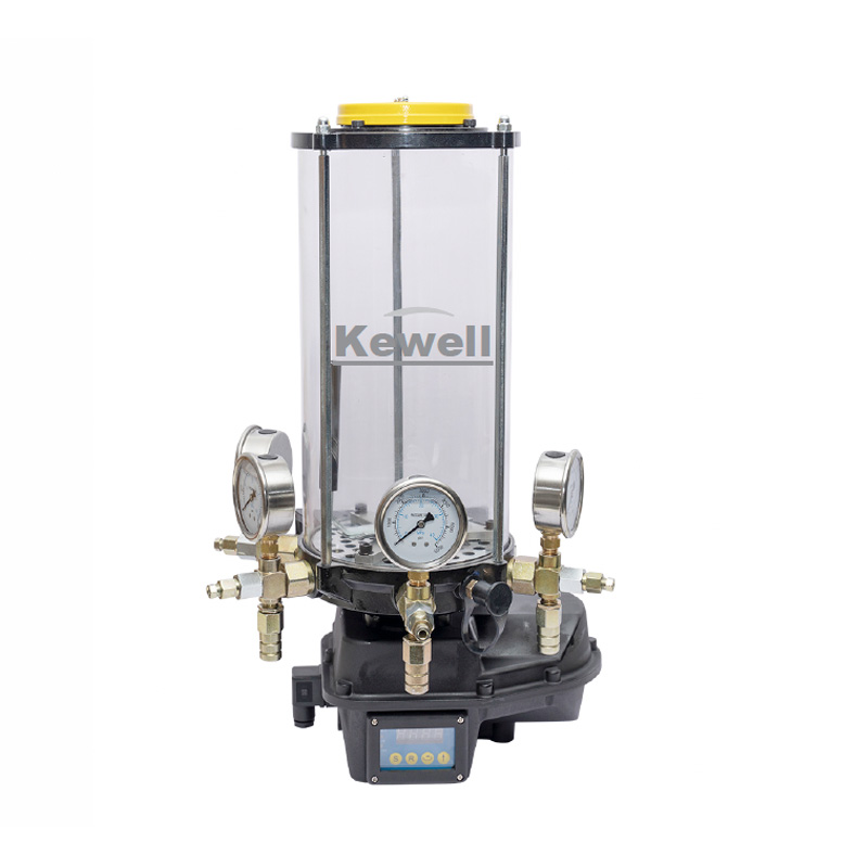 KC electric grease pump is an electric plunger lubrication pump with compactstructure, excellent performance and high output pressure. lt can be equippedwith up to 5 pump units at the same time.in SLR (damped lubrication system).the distributor of each oil outlet can distribute the grease to each lubrication pointproportionally through the control button (CU).In PRG (Progressive LubricationSystem), the distributor of each oil outlet constitutes an independent lubricationsystem. Under the control of the program controller, grease can be delivered toeach lubrication point in a fixed and quantitative manner. lf equipped with an oillevel switch, a low oil level alarm can be realized, and the motor protective covercan be dust-proof and rain-proof. The pump is widely used in engineering,transportation, machine tools, textiles, light industry, forging, steel, constructionand other machinery