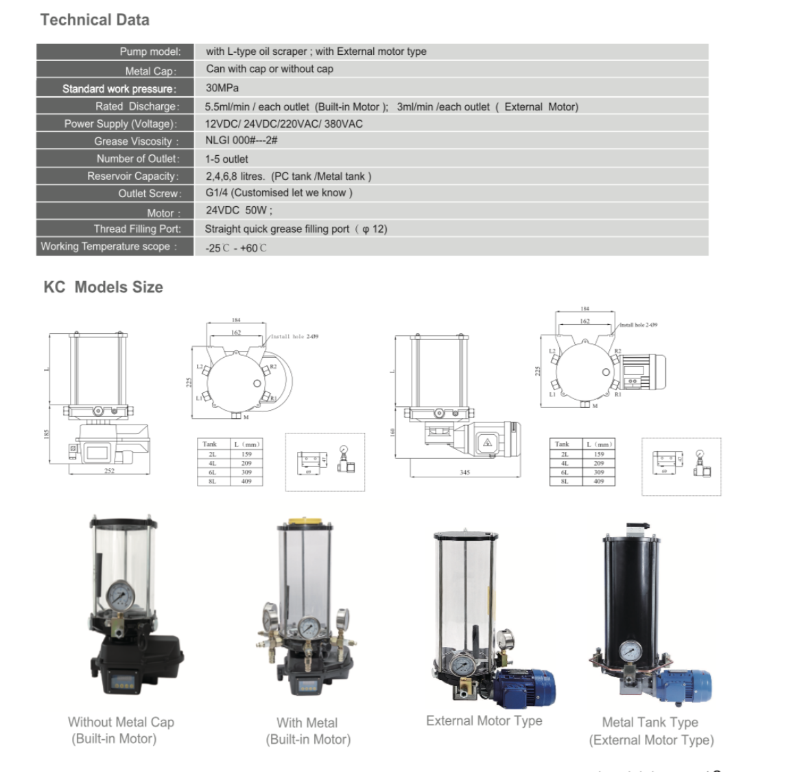 KC electric grease pump is an electric plunger lubrication pump with compactstructure, excellent performance and high output pressure. lt can be equippedwith up to 5 pump units at the same time.in SLR (damped lubrication system).the distributor of each oil outlet can distribute the grease to each lubrication pointproportionally through the control button (CU).In PRG (Progressive LubricationSystem), the distributor of each oil outlet constitutes an independent lubricationsystem. Under the control of the program controller, grease can be delivered toeach lubrication point in a fixed and quantitative manner. lf equipped with an oillevel switch, a low oil level alarm can be realized, and the motor protective covercan be dust-proof and rain-proof. The pump is widely used in engineering,transportation, machine tools, textiles, light industry, forging, steel, constructionand other machinery