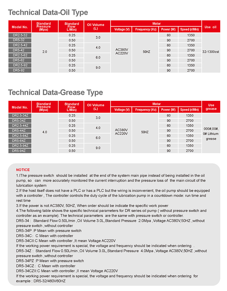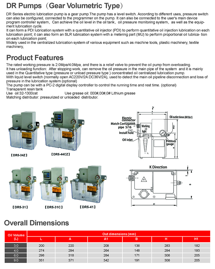 DR Series electric lubrication pump is a gear pump.The pump has a level switch. According to different uses, pressure switch can also be configured, connected to the programmer on the pump. It can also be connected to the user's main device program controller system,Can achieve the oil level in the oil tank,oil pressure monitoring system,as well as the equip- ment lubrication cycle.