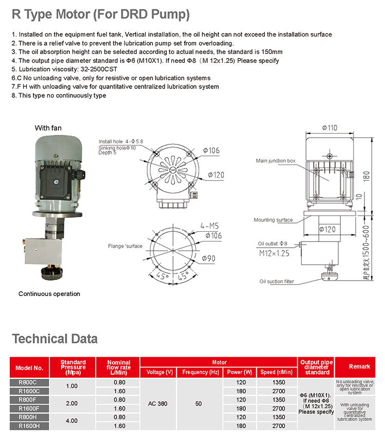 Installed on the equipment fuel tank, Vertical installation, the oil height can not exceed the installation surface . There is a relief valve to prevent the lubrication pump set from overloading.The oil absorption height can be selected according to actual needs, the standard is 150mm.The output pipe diameter standard is Φ6 (M10X1). If need Φ8(M 12x1.25) Please specify.