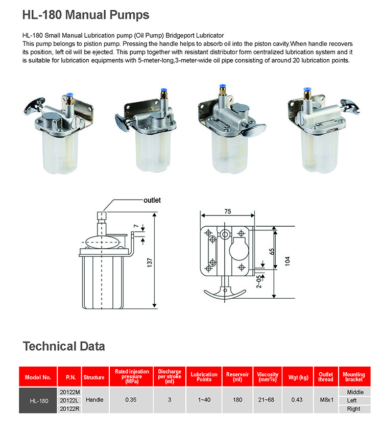 HL-180 Small Manual Lubrication pump (Oil Pump) Bridgeport Lubricator.This pump belongs to pistion pump. Pressing the handle helps to absorb oil into the piston cavity.When handle recovers its position, left oil will be ejected. This pump together with resistant distributor form centralized lubrication system and it is suitable for lubrication equipments with 5-meter-long,3-meter-wide oil pipe consisting of around 20 lubrication points.