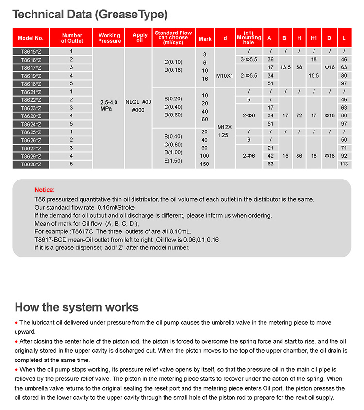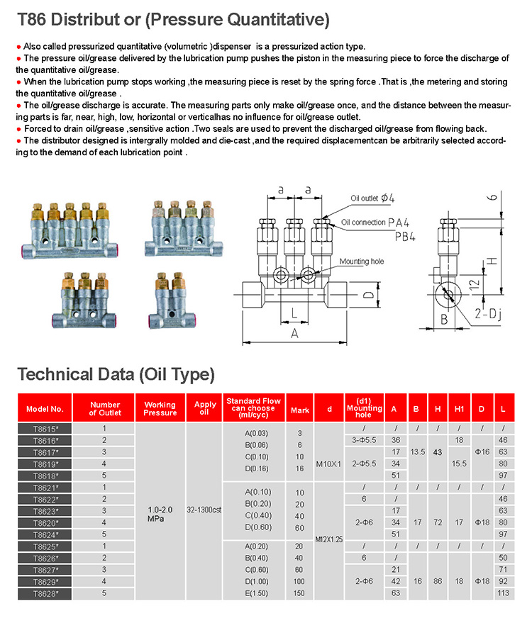 T86 type pressurized quantitative distributor, also known as positivedisplacement quantitative distributor, belongs to the pressurized action type, thatis, the pressure oil agent delivered by the lubrication pump pushes the piston inthe metering part, and the oil agent stored in the metering part chamber last timeis forcefully pressed to the lubrication point, and the oil agent is re-stored in thechamber after the system is unloaded to prepare for the next work.The systemmust work intermittently and the matching lubrication pump must have adischarge function. In a working cycle, the metering parts only discharge oil once.and the distance, near, low, horizontal or vertical installation of the metering partsfrom each other has no effect on the displacement. Accurate measurement,sensitive action, smooth oil drainage. Check valves prevent oil backflow.