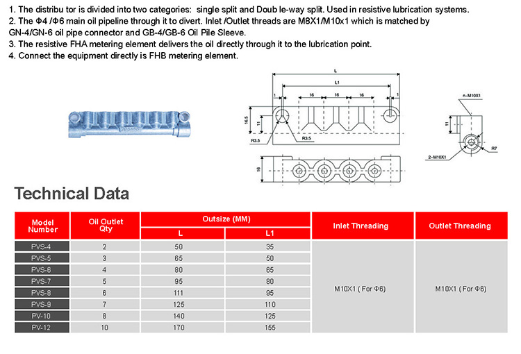 The coupling is divided into unidirectional shunts, with 2-10 oil outlets and a totalof eight sizes. Wide range of applications.Ф4 main oil pipeline relays and divertsthrough it, and its inlet and outlet are threaded at both ends of M8*1, and therelay is used by M8*1 oil pipe joint and 4mm duo cone ferrule, and the endinterface of the system is closed by M8*1 plug. The resistant DPC and DPVseries dosimeters deliver oil directly to the lubrication point via this connection.and if there is an excess connection, it can be closed with an M81 plug. DPC andDPV series of measuring parts directly connected to the lubrication point of theequipment. Through it relay and divert, it should be connected with Ф4 tubing,M8*1 tubing fittings and 4mms duo-cone ferrule.
