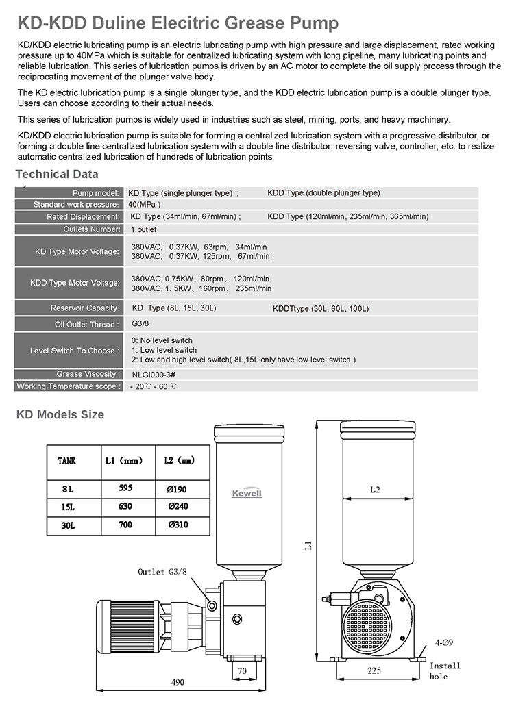 The electric lubrication pump is a single plunger type, which can be selectedaccording to the actual demand. The pump is widely used in steel, port, heavymachinery and other industry equipment. The electric lubrication pump is suitablefor progressive distributor to form a single-ine centralised lubrication system,also can be matched with double-line distributor, reversing valve, controller andother components of the double-line centralised lubrication system, to achieveautomatic centralised lubrication of hundreds of lubrication points.