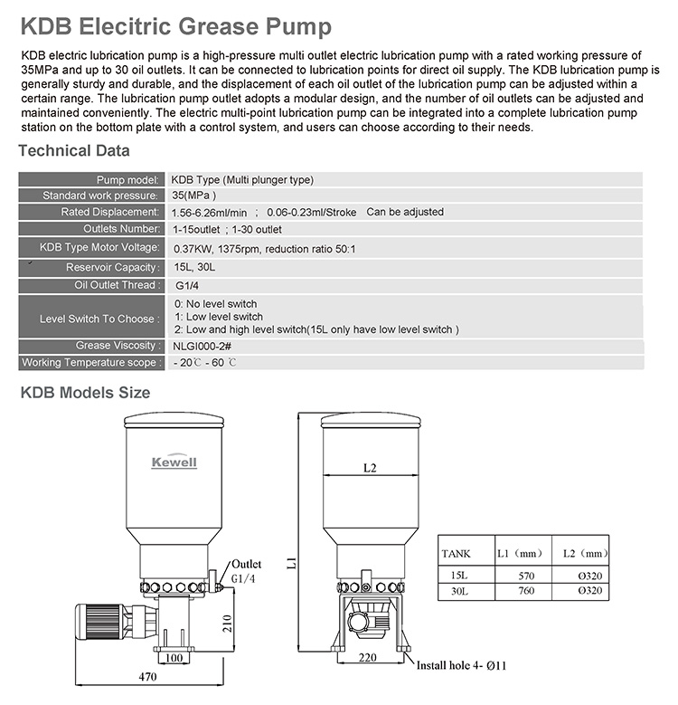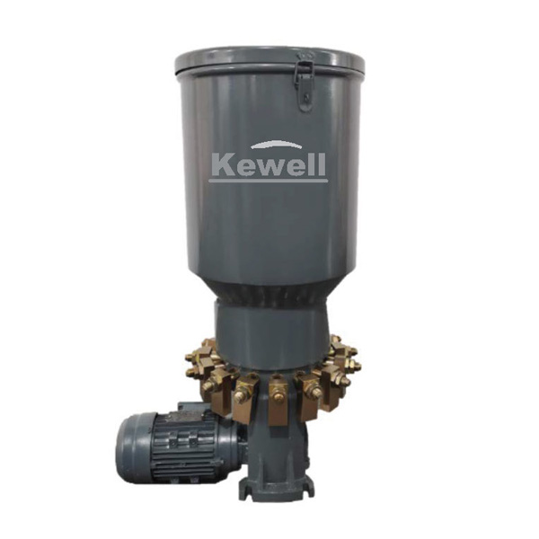 KDB type electric grease pump is a compact structure, excellent performance,high output pressure electric plunger lubrication pump, up to 24 pump units at the same time, and can be arbitrarily chosen..Equipped with an independent relief valve to prevent pressure overload of the pump unit, and can complete the centralized overflow return function in SLR, each oil outlet has its own distributor to distribute the grease proportionally to each lubrication point through the CU.Inthe progressive lubrication system, the distributor of each oil outlet forms an independent lubrication system, and under the process controller, the grease can be delivered to each lubrication point at regular and quantitative intervals.lf equipped with an oil level switch, it can achieve a low oil level alarm, and the motor protective cover can prevent dust and rain.The pump is widely used in engineering, transportation, mining, forging, steel, construction and other machinery.