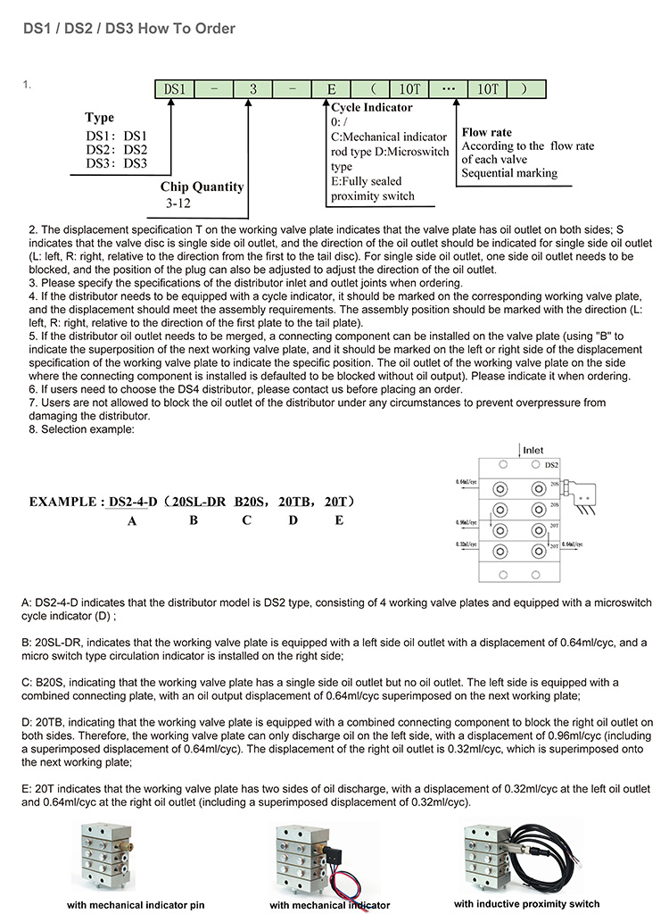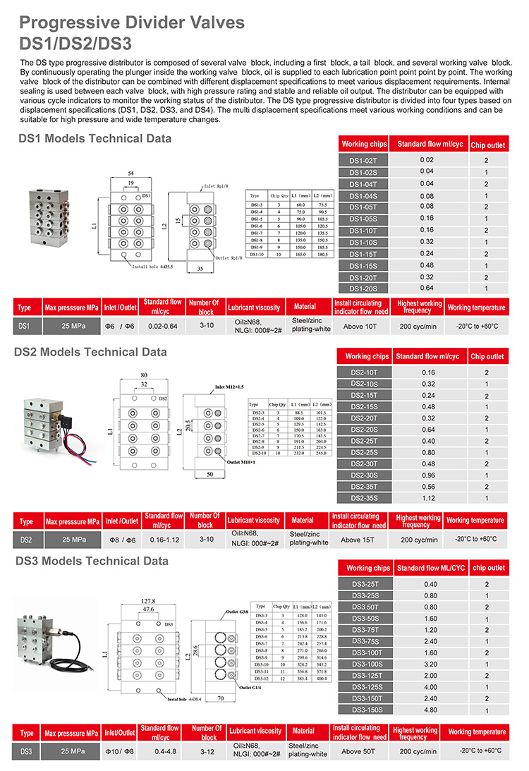 The DS type progressive distributor is composed of several valve block, including a first block, a tail block, and several working valve block. By continuously operating the plunger inside the working valve block, oil is supplied to each lubrication point point point by point. The working valve block of the distributor can be combined with different displacement specifications to meet various displacement requirements. Internal sealing is used between each valve block, with high pressure rating and stable and reliable oil output. The distributor can be equipped with various cycle indicators to monitor the working status of the distributor. The DS type progressive distributor is divided into four types based on displacement specifications (DS1, DS2, DS3, and DS4). The multi displacement specifications meet various working conditions and can be suitable for high pressure and wide temperature changes.