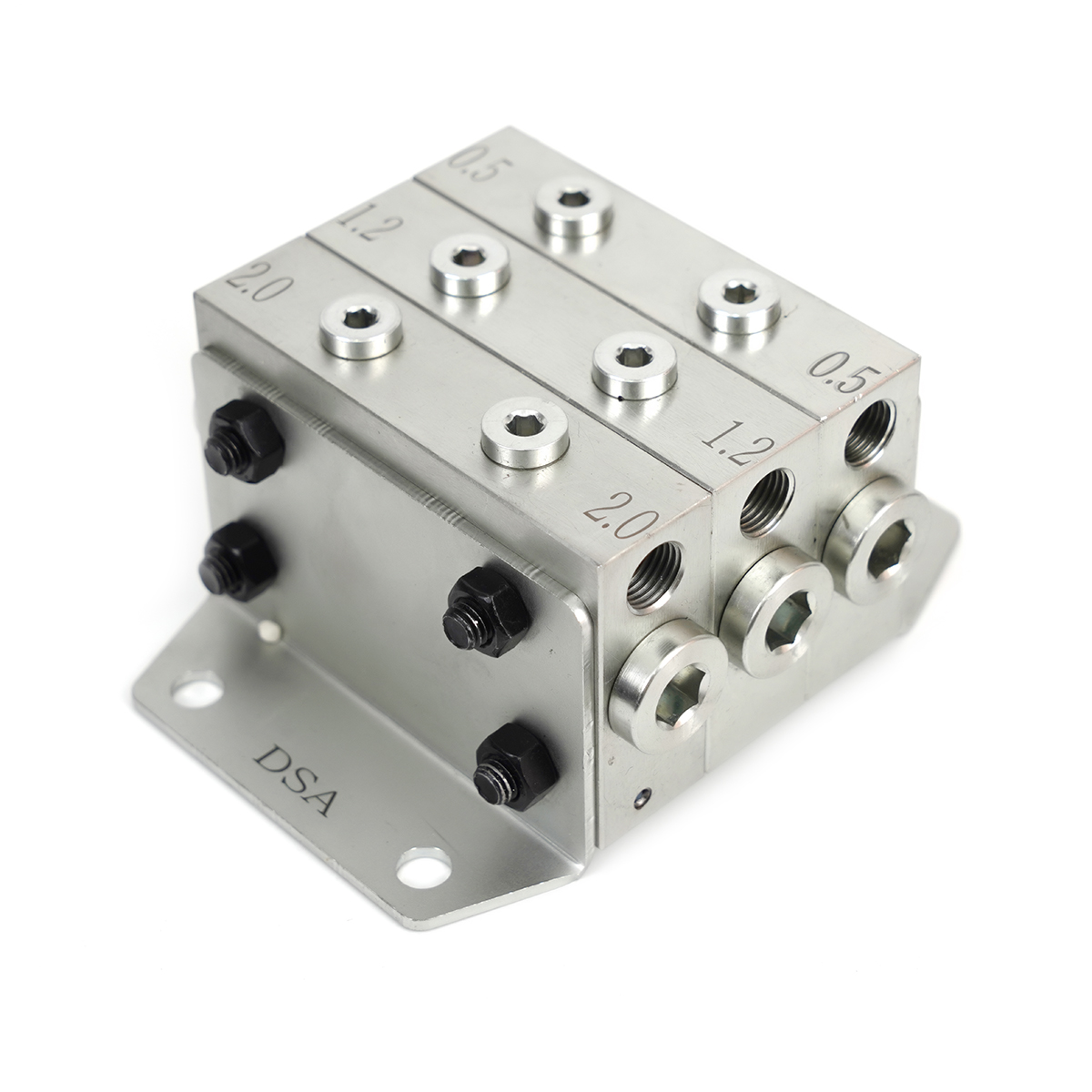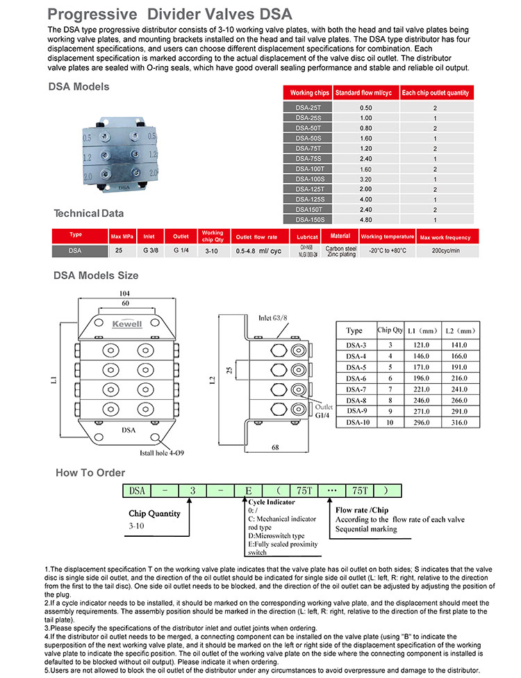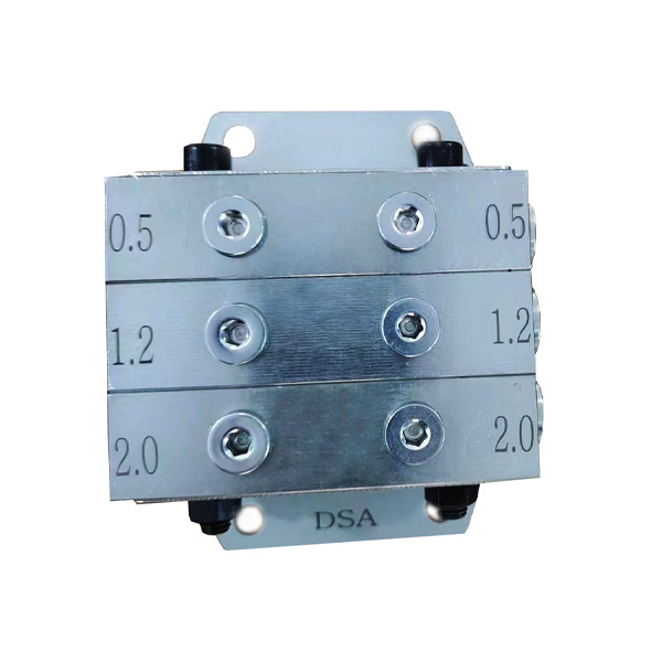 The DSA type progressive distributor consists of 3-10 working valve plates, with both the head and tail valve plates being working valve plates, and mounting brackets installed on the head and tail valve plates. The DSA type distributor has four displacement specifications, and users can choose different displacement specifications for combination. Each displacement specification is marked according to the actual displacement of the valve disc oil outlet. The distributor valve plates are sealed with O-ring seals, which have good overall sealing performance and stable and reliable oil output.