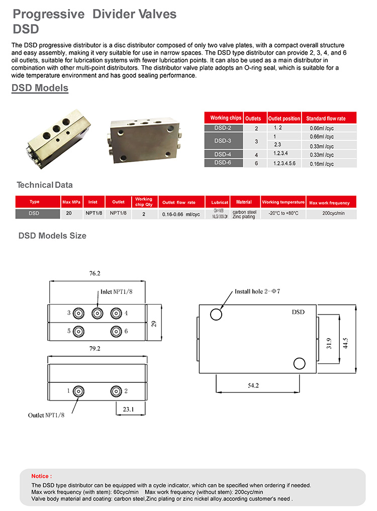 The DSD progressive distributor is a disc distributor composed of only two valve plates, with a compact overall structure and easy assembly, making it very suitable for use in narrow spaces. The DSD type distributor can provide 2, 3, 4, and 6 oil outlets, suitable for lubrication systems with fewer lubrication points. It can also be used as a main distributor in combination with other multi-point distributors. The distributor valve plate adopts an O-ring seal, which is suitable for a wide temperature environment and has good sealing performance.