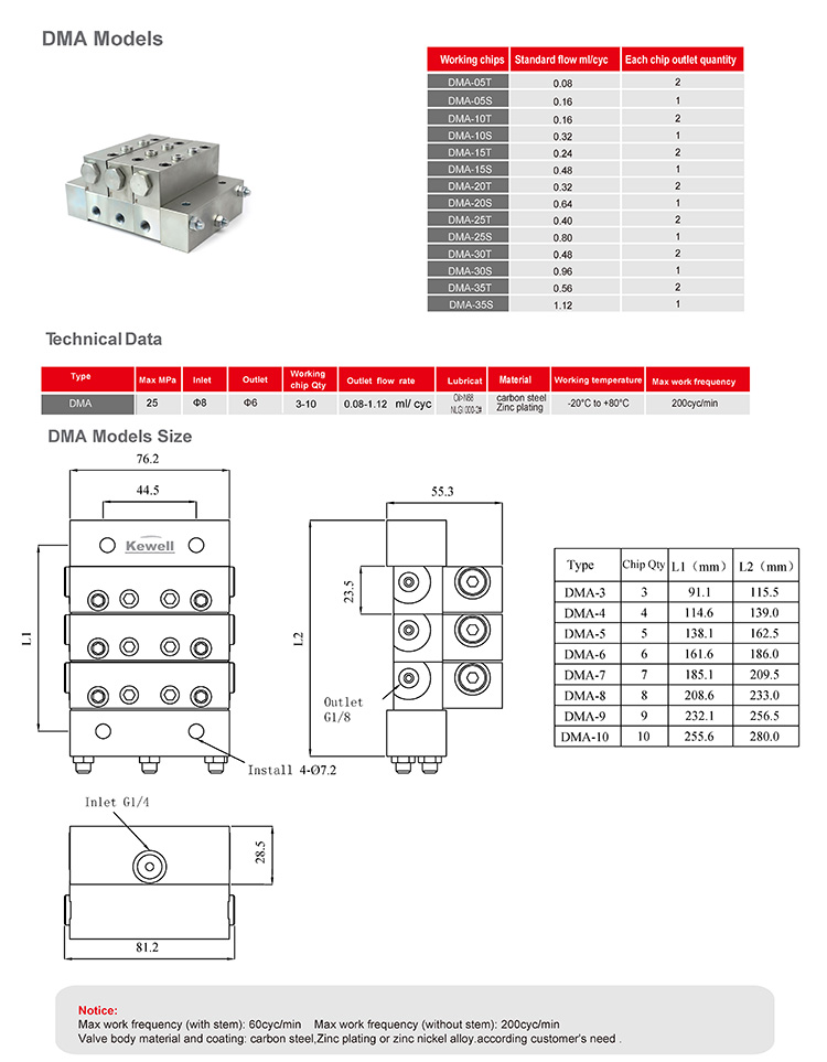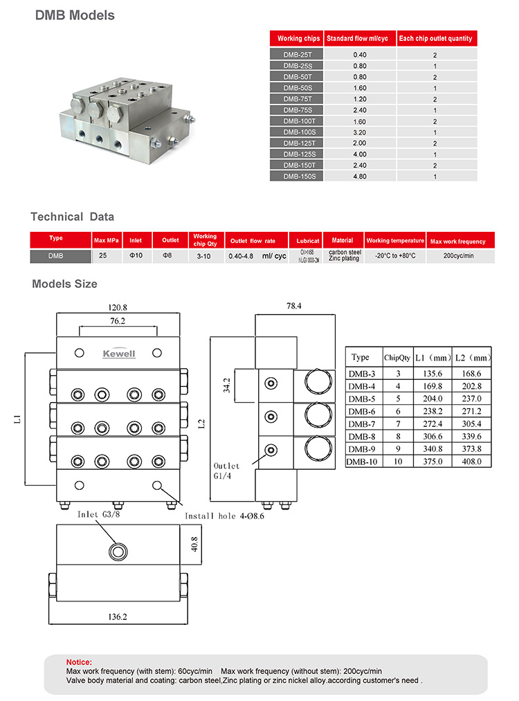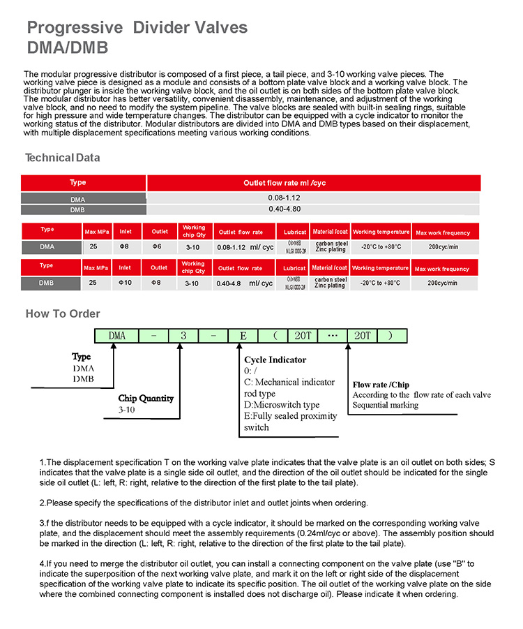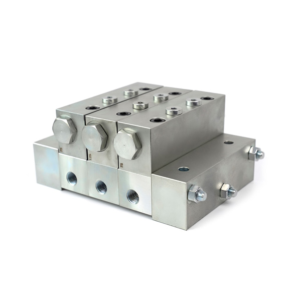 The modular progressive distributor is composed of a first piece, a tail piece, and 3-10 working valve pieces. The working valve piece is designed as a module and consists of a bottom plate valve block and a working valve block. The distributor plunger is inside the working valve block, and the oil outlet is on both sides of the bottom plate valve block. The modular distributor has better versatility, convenient disassembly, maintenance, and adjustment of the working valve block, and no need to modify the system pipeline.