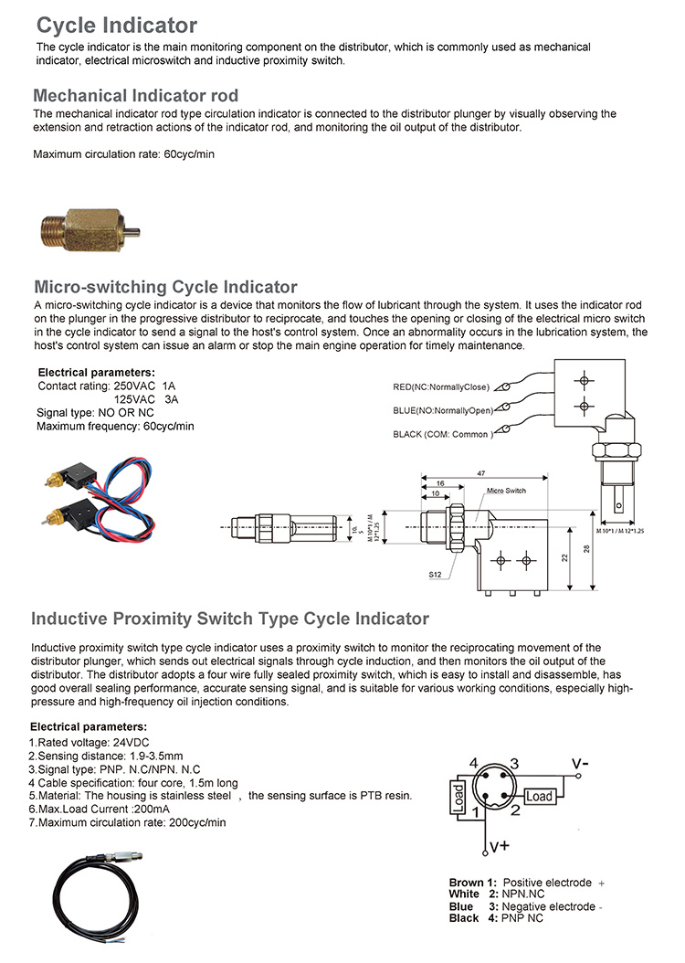 A micro-switching cycle indicator is a device that monitors the flow of lubricant through the system. It uses the indicator rod on the plunger in the progressive distributor to reciprocate, and touches the opening or closing of the electrical micro switch in the cycle indicator to send a signal to the host's control system. Once an abnormality occurs in the lubrication system, the host's control system can issue an alarm or stop the main engine operation for timely maintenance.