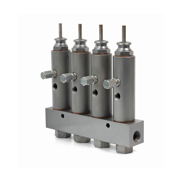 Series quantitative oil filler with adjustable dispenser 2-10 holes Pressureand explosion resistant, anti-corrosion and rust resistant.DL injector is suitable for high pressure filling conditions. Precise and quantitative oil filling is achieved through internal plunger action. DL injector is of single pillar plug type structure. Several single injector are connected in series by oil circuit to form multiple oil outlet. Each oil outlet has an adjusting indicator rod, can continuously adjust the amount of oil without stopping, each oil outlet is independent of each other, stable and reliable operation. DL lubricator produces oil during pressure and stores oil during system pressure relief. The DL injector has a fluorine rubber seal and is suitable for high temperature use (up to 176℃) . According to different displacement, it is divided into DL1 type DL2 type and DL3 type.