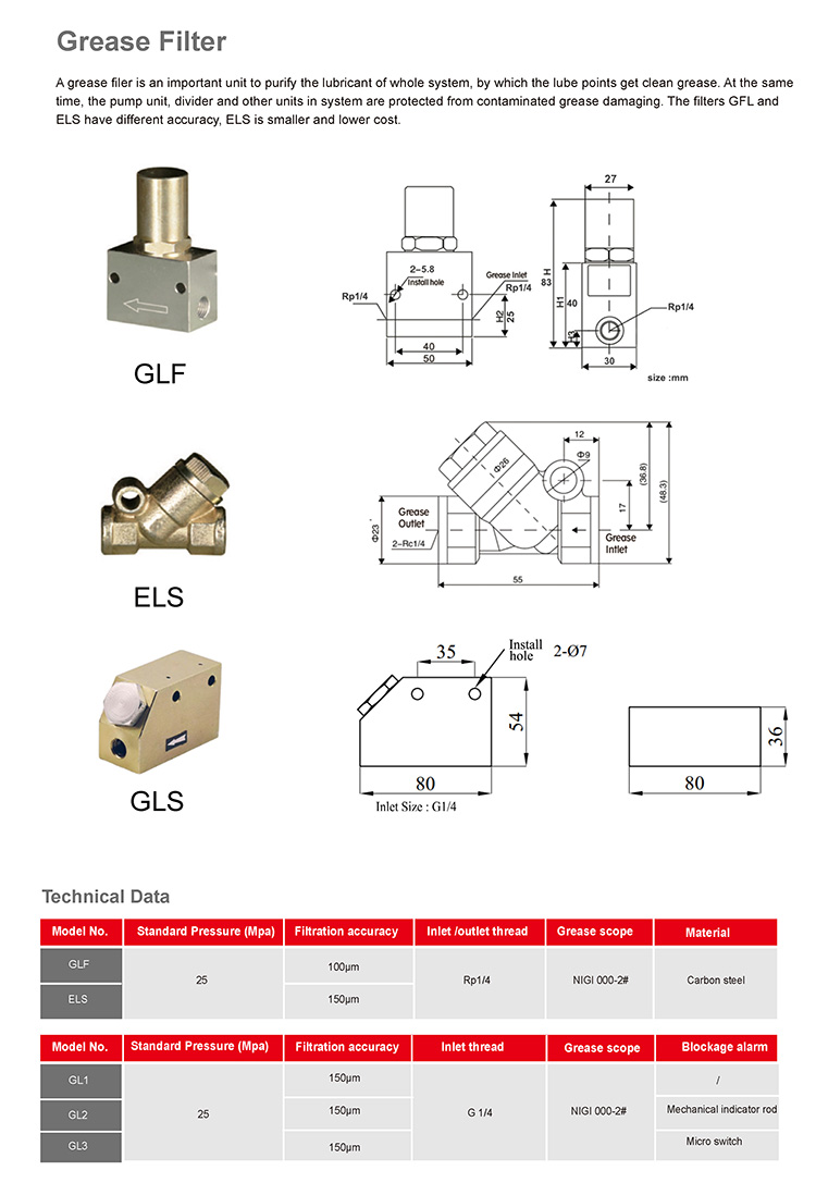 A grease filer is an important unit to purify the lubricant of whole system, by which the lube points get clean grease. At the same time, the pump unit, divider and other units in system are protected from contaminated grease damaging. The filters GFL and ELS have different accuracy, ELS is smaller and lower cost.