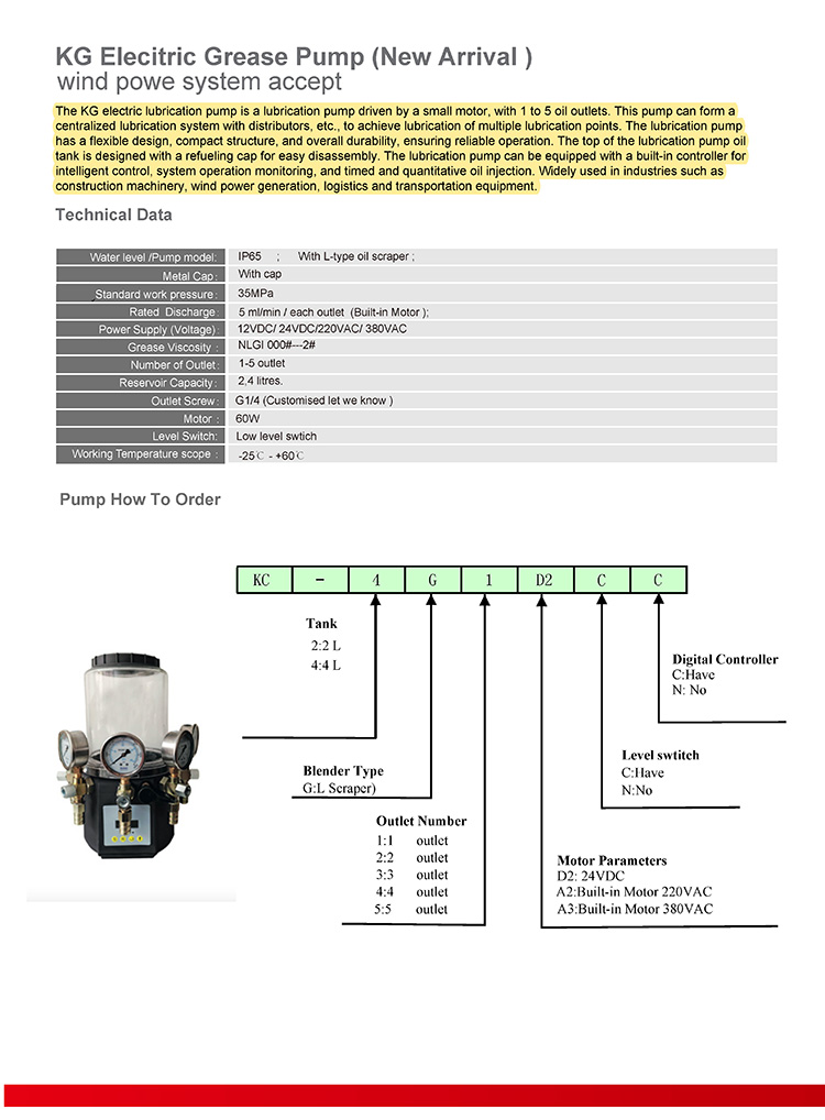 The KG electric lubrication pump is a lubrication pump driven by a small motor, with 1 to 5 oil outlets. This pump can form a centralized lubrication system with distributors, etc., to achieve lubrication of multiple lubrication points. The lubrication pump has a flexible design, compact structure, and overall durability, ensuring reliable operation. The top of the lubrication pump oil tank is designed with a refueling cap for easy disassembly.