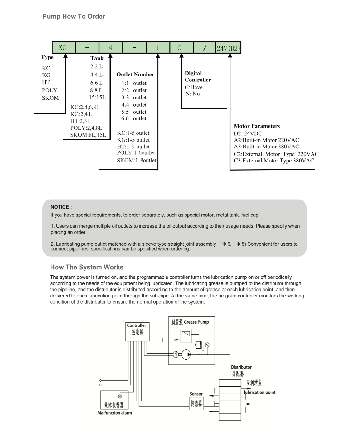 The KG electric lubrication pump is a lubrication pump driven by a small motor, with 1 to 5 oil outlets. This pump can form acentralized lubrication system with distrbutors, etc, to achieve lubrication of multiple lubrication points. The lubrication pumphas a fexible design, compact structure, and overall durability, ensuring reliable operation. The top of the lubrication pump thank is designed with a refueling cap for easy disassembly.