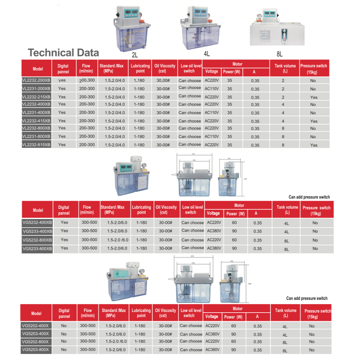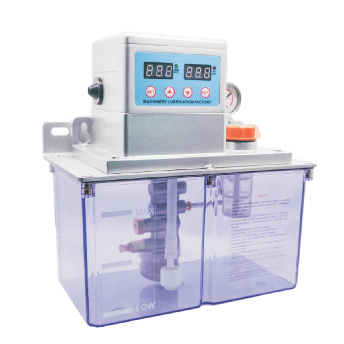 This Series electric lubricator includes a motor-driven gear pump of superior structure.can use lubricating oil with viscositybetween 30cst-00#. Its oil tank volume has three specifications of 2 liters, 4 liters and 8 liters.This kind of pump is equippedwith a level switch, while a pressure switch can be provided according to diferent applications. These are connect-ed withproqrammed controllers on the pump, or programmed control system on main user eguipment to control and monitor oilevel in reservoir, supply system pressure and setting of lubrication cycle. lt is widely used in centralized lubrication systemsfor machine tools, plastics, textiles, ight industry, printing, auto escalators and conveyers, among other mechanica equipment.