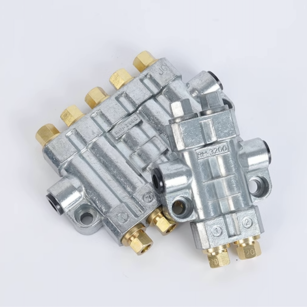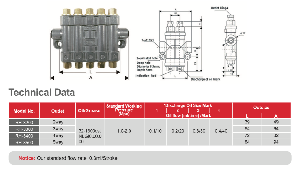 Known volumetric dispenser (dosing type), of the pressure relief action type. Thepressure delivered by the lubrication pump pushes the oil agent to the precisestorage of the piston in the dispenser, the pressure is relieved when the oil pumpstops working and the dispenser piston delivers the quantitative oil agent to thelubrication point. Discharge precise, in a supply cycle dispenser only dischargeoil once, and in the lubrication system in the distance between each other far.near, high, low, lying or vertical installation are no effect on the dispenserdischarge. Forced oil discharge with sensitive action and two seals to preventbackflow of the discharged oi.RH volumetric distributor, stores oil when the system is pressurized, and be oiling when the system is depressurized. Thisseries can quantitatively deliver the lubricating oil to each lubrication point according to the specified main oil quantity specification.RH series have two oulets, three outlets, four outlets, five outlets, and four outlet ports. They are widely used inlubrication systems for printing, plastics, packaging, cnc machine and other mechanical equipment.