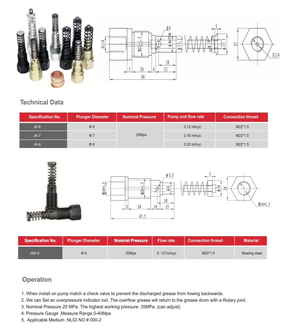 The pump unit, also known as the plunger pair, is the core component of theelectric grease lubrication pump, precision machined from bearing steel andequipped with a built-in check valve. The highest pressure can reach 25Mpa, theminimum matching gap is 3-5um. The rated displacement is 0.12cc or 0.18cc.The pump element transports lubricating pressure fluid, and at the same timegenerates back pressure on the working resistance of the connectedactuator.The function of the pump element is to make the piston of the pumpelement push and pull through the eccentric wheel to suck in the grease or oil inthe element cavity, and then pressurize the grease or oil into the pipeline.
