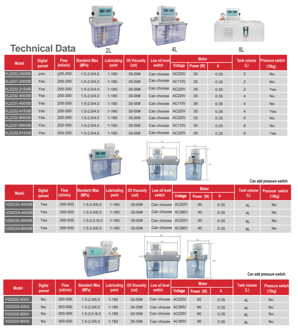 This Series electric lubricator includes a motor-driven gear pump of superior structure.can use lubricating oil with viscositybetween 30cst-00#. Its oil tank volume has three specifications of 2 liters, 4 liters and 8 liters.This kind of pump is equippedwith a level switch, while a pressure switch can be provided according to diferent applications. These are connect-ed withproqrammed controllers on the pump, or programmed control system on main user eguipment to control and monitor oilevel in reservoir, supply system pressure and setting of lubrication cycle. lt is widely used in centralized lubrication systemsfor machine tools, plastics, textiles, ight industry, printing, auto escalators and conveyers, among other mechanica equipment.