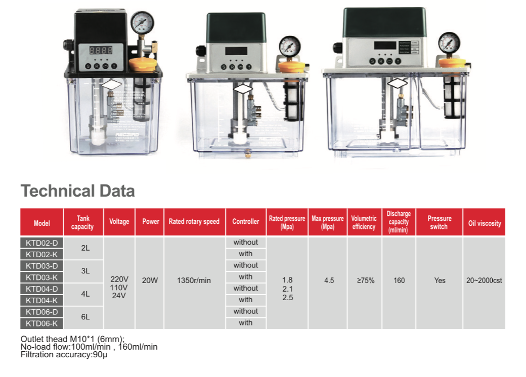 KTD Series electric lubrication pump is a gear pump. lts oil tank volume has four specifications of 2 liters, 3 liters and 4iters 6 liters. The pump has a level switch According to diferent uses, pressure switch can also be configured ,connectedto the programmer on the pump. lt can also be connected to the user's main device program controller system, Canachieve the oil level in the oil tank,ol pressure monitoring system,as well as the equipment lubrication cycle.
